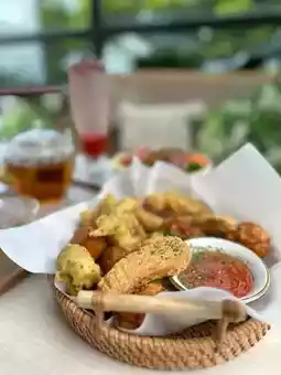 The seafood platter includes squid balls, hairtail fish rolls, chicken fillets, and golden fish nuggets.