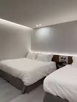 The room continued the overall minimalist aesthetic, with clean white walls and warm-toned furniture. It was clean and sleek, yet warm. Lying on the soft bed, I could hear the whispers of the night outside, letting the fatigue of travel fade away in a moment of tranquility.