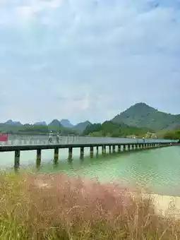✔️A wooden boardwalk leads to a small island in the heart of the lake. The clear lake reflects the surroundings like a mirror, with karst peaks rising around it. Overcast days bring a hazy charm, while sunny days offer blue skies and sparkling waters.