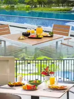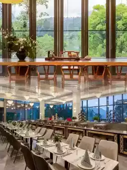 The hotel’s hot spring area is a paradise! Stone paths wind through bamboo groves, leading to over 20 pools tucked among flowers—think rose petal-infused baths, herbal mugwort pools, and even a photogenic glass-boat hot spring. After soaking, we headed straight to the cliffside infinity pool. Jumping into the water in summer, with the shimmering Fairy Lake below and rolling tea fields in the distance, every shot looked like a magazine spread 📸 Pro tip: The hot spring area is most stunning at 6 PM when the sunset paints the bamboo forest gold—don’t forget your camera!