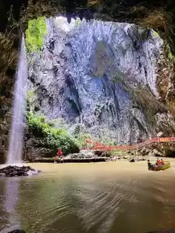 The Celestial Cave, located in Jiulong Town, Yingde, is renowned as the "Number One Pit in South China." It is a popular tourist destination in Qingyuan. Formed by karst topography, the site features a massive skylight-like sinkhole above, a deep pit cave within, and a river flowing below.