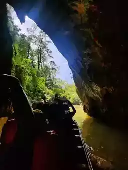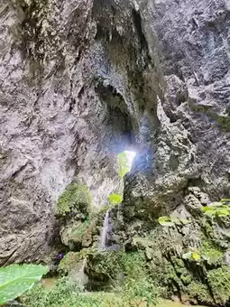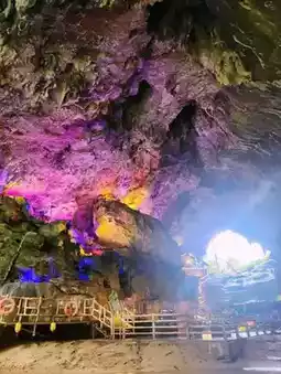 As the sightseeing boat glides gently into the cave, visitors are greeted by stunning formations of rocks, stalactites, waterfalls, and lush greenery shaped by the passage of time.