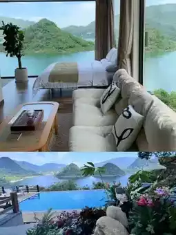 The homestay features an infinity pool, hot spring soaking pool, lake view restaurant, book bar, chess and card room, barbecue area, and basketball court. It offers free afternoon tea, luggage storage, and tea brewing by the fireplace. The staff are warm and friendly, and even after check-out, guests receive complimentary fruit and hot tea. Next to the homestay is the Longxu Dai Reservoir dam, where you can take an evening walk and watch the sunset. Nearby attractions include Jinlong Cave Underground River, Yingxi Fenglin, Gulong Gorge, and Bijia Mountain.