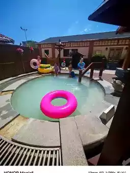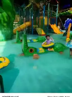 We went to the water park around 9:00 PM. It's not big, but it's great for kids. The adult slide opens at 11:00 AM, but you can't use it with glasses. The room temperature and water temperature were quite warm. You can bring your own drinks or a cup. The park offers free hot water ice cream for 6 yuan, iced tea and cola for 5 yuan, all good.