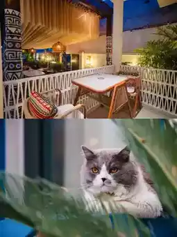 The blue and white tones perfectly blend into Six Star Street, not at all out of place, and exactly the same blue as Sailimu Lake! The courtyard is large, with carpets and other soft furnishings featuring Xinjiang characteristics, and there is a kitten to pet~
