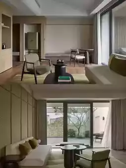 2. When the In-between Architects design team conceived the spatial layout of the rooms, they tried to incorporate as much sunlight as possible to make the interior bright and warm. Yixing is known as the "capital of pottery", and there are bamboo forests and tea gardens on the hillside. When conceiving the interior design of the rooms, in addition to considering the spatial layout and material matching, they also thought about what could happen in the space. The designer would imagine who would stay in the hotel? A couple or a family? Each room has a tea cabinet for storing tea or cakes, etc., to create a little surprise for the residents and leave an unforgettable accommodation experience.