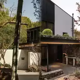 This winding stone path in the 70-acre mountain forest connects the world with this hidden residence. There are bamboos, cypresses, camphor trees, hibiscus, persimmon trees, and nandina in the mountain forest, as well as tea fields and countless shrubs. Although it is already late autumn in Jiangnan, the forest is still lush, quickly sketching this hidden secret realm in front of me. This hidden residence is called "Chunshan Zaiwang." This 6,000-square-meter building, transformed by designer Xie Ke, is hidden in this mountain forest. Under the cover of green pines and bamboos in front of the door, it looks even more elegant and refined.