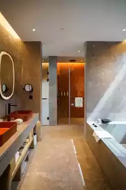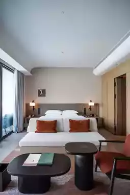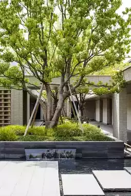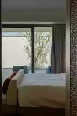 The overall architecture of the hotel is inspired by the traditional villages in Jiangnan, introducing landscapes into the interior. The stacked landscapes at the main entrance cleverly create a secluded paradise in the city. Walking in the public area of the guest rooms, there is an atmosphere of winding paths. The 102 rooms are divided into two colors: terracotta red and natural green. I stayed in a courtyard room, and the crabapple flowers in the yard were in full bloom, with light and shadows dancing in the wind. This room is also very suitable for pets. The building has a maximum of only two floors, with good privacy, and the king rooms are all located on the first floor.