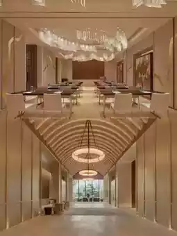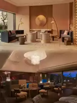 The Yixing Yadaxi Mountain Hyatt Regency Hotel consists of six main buildings scattered across the undulating terrain, connected by winding corridors, each turn framing a different picturesque mountain view. At the heart of the hotel lies a mirrored pool, inspired by Yixing's renowned underground cave lake.