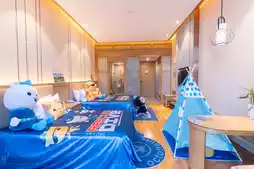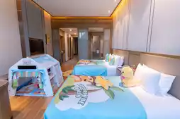 Experience the charm of themed rooms, such as the Dino-themed room, where the fresh yellow-green color scheme creates a bright and lively atmosphere. The soft and adorable Dino bedding features playful expressions and poses, making you smile instantly. Lying on the bed feels like being gently embraced by Dino. Beside the bed, there's a giant plush Dino toy with a chubby body and innocent big eyes, inviting kids to play and share secrets. In the corner, a custom Dino-themed tent awaits, adorned with vivid Dino patterns, where children can unleash their imagination and embark on an adventure.