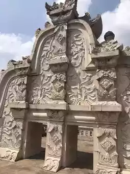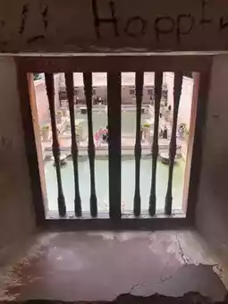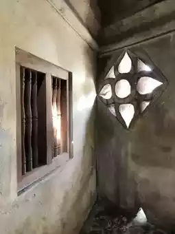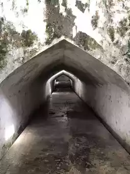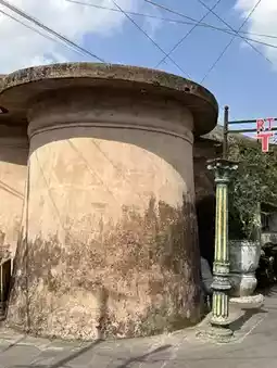 Collapsed due to a major earthquake, many residents used the rubble to build homes, and now several buildings remain within a residential area