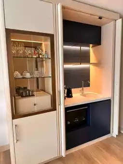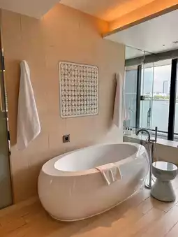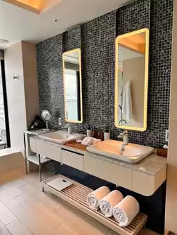 We stayed in an 80-square-meter one-bedroom balcony suite at InterContinental Yokohama Pier 8. We were amazed as soon as we opened the door. The light that turned on automatically when the door opened revealed a fresh and elegant design and atmosphere. The bright decoration style made people feel refreshed, and their mood became cheerful and light. Every corner of the room showed exquisite taste and texture. There was a sink and a cabinet with a full sense of design at the entrance. There was a mini bar, a small refrigerator, and even a celebrity-level sea view terrace.