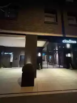 The hotel's exterior has a simple and chic design with a brown base. The "citadines" sign shines subtly on the facade, giving it a quiet presence like a luxury residence.