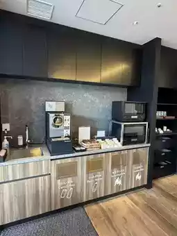 It has power outlets and Wi-Fi, making it perfect for light work or computer work. There are also free drinks and a water server, so it's also great for taking a break with a cup of coffee.