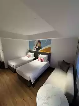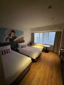 ● The premium twin bed I stayed in this time is spacious, with colorful accents on the cushions and art.
