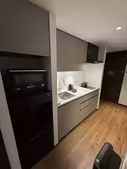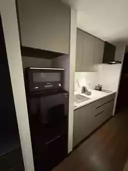 The kitchen is equipped with an induction stove, refrigerator, and microwave. It is fully equipped with pots, pans, dishes, and cutlery, so you can cook your own meals. You can cook the ingredients you bought at the nearby supermarket or convenience store. There are Family Mart and 7-Eleven convenience stores nearby, which are convenient.