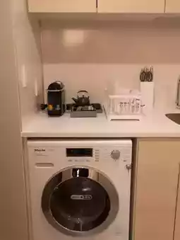 The rooms are equipped with a full-fledged kitchen with an induction stove, microwave, refrigerator, tableware, and more, as well as a washer/dryer.