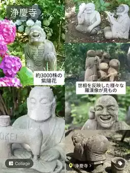 ★ A group of arhat statues in various outfits. These expressive and friendly arhat statues are placed all over the temple grounds, and are full of things to see. Don't miss the statues making masks and administering vaccinations! ★The grounds are surrounded by greenery. As you go up the stairs, you will see various hydrangeas on the slope.