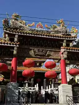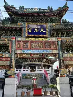 This Chinese-style temple enshrines Mazu, the guardian deity of the sea. Its vibrantly colorful decorations are beautiful, and during the Chinese New Year, prayer slips and gold leaf paper are displayed. The worship process is unique: purchase incense at the entrance and then pray in order.