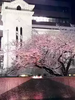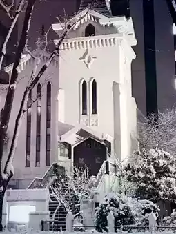 Yokohama in March. On a miraculous snow-covered day, the lightly white-washed street corners cast an even more mystical light on the stately churches. The Yokohama Kaigan Church of the Japanese Christian Church, founded in 1872, is a historic building rebuilt in 1933 after surviving war damage. Even today, the chapel is open to the public once a month, making it a perfect spot for an evening stroll.