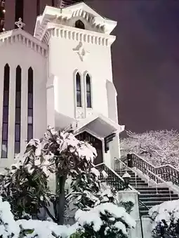 The church's dignified presence on a quiet, snow-flecked evening in March creates a mystical scene.