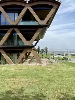 This freshly developed space offers a grassy plaza by the sea, perfect for a relaxing stroll, picnic, or just soaking up the ocean breeze. The architecture itself is a showstopper—bold, modern, and beautifully designed with timber accents that give it a warm, coastal vibe.