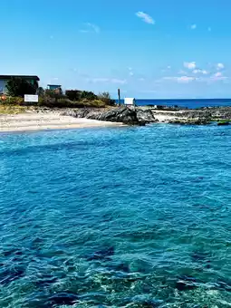 The beach is sandy in the front and rocky in the back, and the water was very clear and blue.