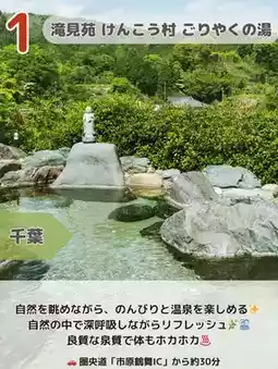 ① Takimien Health Village Goriyaku no Yu (Otaki Town, Chiba Prefecture) 📍 176 Awamata, Otaki Town, Isumi District, Chiba Prefecture 🚗 Approximately 30 minutes via national highway from Ichihara-Tsurumai IC on the Ken-O Expressway 🚃 Approximately 19 minutes by bus from Yoro Keikoku Station on the Kominato Railway 💰 ¥1,200 for adults, ¥800 for elementary school students, ¥600 for infants ♨️ Relax in the large open-air bath overlooking the valley and in the beauty-enhancing waters. Enjoy a relaxing day out exploring the surrounding area!