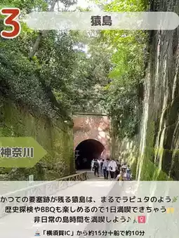 ③ Sarushima Island (Yokosuka, Kanagawa) 📍 Yokosuka City, Kanagawa Prefecture | Experience an adventure on a deserted island in Tokyo Bay 🏝️🔦 Sarushima Island, with its remains of a former fortress, is reminiscent of Laputa! Enjoy an extraordinary island experience, including historical exploration and BBQs! ♪🚗 Access: Approximately 15 minutes by car from Yokosuka IC on the Yokohama-Yokosuka Expressway (→ Approximately 10 minutes by boat from Mikasa Terminal) 🚃 Access: Approximately 15 minutes on foot from Yokosuka Chuo Station on the Keikyu Line (to Mikasa Pier) 💰 Price: Boat fare: ¥1,500 for adults, ¥750 for elementary school students (park admission included)