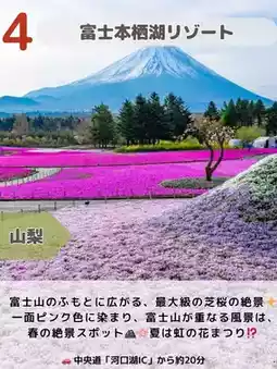 ④ Fuji Motosu Lake Resort (Minamitsuru District, Yamanashi Prefecture) 📍 212 Motosu, Fujikawaguchiko-cho, Minamitsuru District, Yamanashi Prefecture 🚗 Approximately 20 minutes from Kawaguchiko IC on the Chuo Expressway 🚃 Approximately 40 minutes by Fuji Shibazakura Liner from Kawaguchiko Station on the Fujikyu Railway 💰 Free admission (fees apply during the peak Shibazakura Festival) 🌸 A breathtaking spot to relax and enjoy the view of Mt. Fuji and 500,000 moss phlox ✨