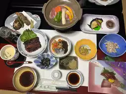 Dinner was delicious, with sashimi, stir-fried burdock, clam chawanmushi, fish dishes, beef teppanyaki, and taro roe soup. 😋