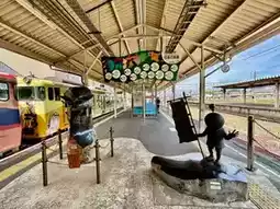 Although the station's exterior is understated, upon entering the plaza, you'll be greeted by Gegege no Kitaro and yokai decorations, instantly immersing yourself in Sakaiminato's yokai culture. The station is well-equipped with tourist information, convenience stores, and restaurants, making it ideal for independent travelers. While its open-plan design can make the waiting area a bit stuffy in the summer, there are air-conditioned cabins for relaxation.