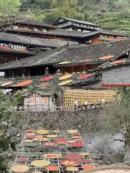 The whole village is surrounded by green mountains🌄, wooden stilted buildings are scattered🏠, streams are flowing💧, and the old bluestone road is full of rustic charm👣. In the early morning🌅, standing on a high place, the ancient village is surrounded by clouds and mist, like a fairyland😃. At night, the red lanterns light up🏮, and you fall asleep with the sound of the stream, it's so comfortable😴.