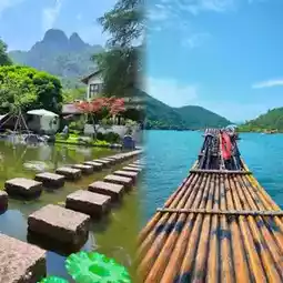 1. Bamboo Rafting: Drift downstream on a bamboo raft, admiring the riverside forests and ancient villages, experiencing the poetic scenery of "emerald waters and misty mountains" (Lion Rock section recommended).
