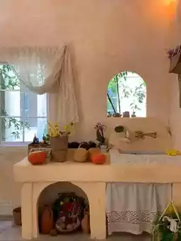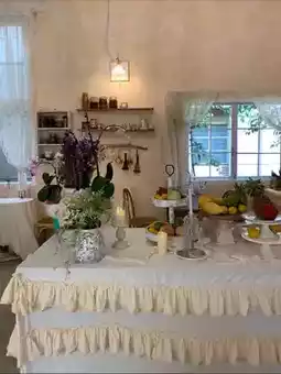 Stepping inside, the warm yellow walls seem kissed by sunlight, soft and cozy. White lace curtains hang gently, swaying slightly with the breeze, as if dancing an elegant dance. The wooden furniture carries the texture of time, each grain telling an ancient story. Lively green plants and bright flowers decorate the corners and tables, and the air is filled with a faint floral fragrance. Taking a deep breath, even the air feels sweet.