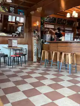 Wooden furniture, checkered tiles, and diamond-shaped window frames add a cozy touch to the space.