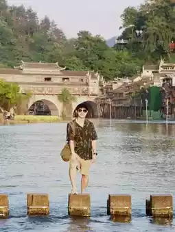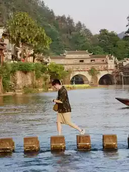 Strolling along the stone-paved streets in the early morning, stepping onto the stepping stones of the Tuojiang River