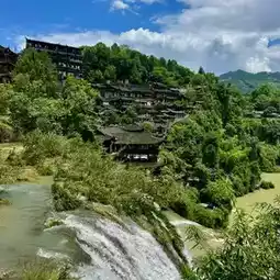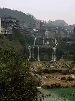 Furongzhen Ancient Village, an old town located on a cliff above a large waterfall in the middle of a valley