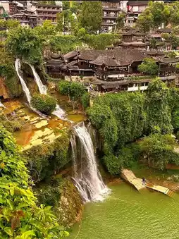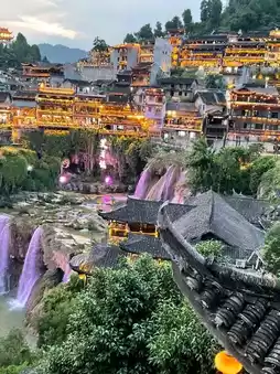 At night, the Furong Waterfall becomes even more magical and iconic. Powerful spotlights and soft lanterns light up the 60-meter-high waterfall as it cascades down the cliffs right through the ancient Furong Village. The stilted wooden houses and stone paths around it glow with warm lights, and mist from the waterfall mixes with the colored lights, creating a dreamy, fairy-tale scene.