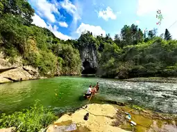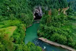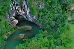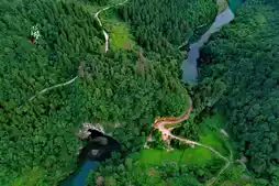 There are many places with natural bridges, and here is a village in Yongshun County that is named directly after its natural stone bridge, called "Zishengqiao Village." The village is located by the Shi River, in the river section between Diaojing Township and Laosicheng. The Shi River passes through the natural bridge here, and not far downstream is the Siliu Waterfall. A few kilometers further downstream is Laosicheng. Continuing downstream, you will reach the Mengdong River rafting area. This small river is definitely a scenic river. Back to the point, the natural bridge in Zishengqiao Village is 50 meters wide, 30 meters high, and 80 meters long. After flowing over a small shoal, the river water enters the cave of the natural bridge and flows out about 80 meters later from the other end of the bridge. At the entrance of the cave, the incoming sand has accumulated into a small sand island that can accommodate dozens of people. This place is only about a 40-minute drive from Yongshun County town and is a great spot to cool off in the summer. On hot summer days, many people drive here. There is a small simple parking lot on the shore that can squeeze in about 10 cars. From the parking lot, stone steps lead down to the riverbank. Many people are playing in the water by the river. A small wooden boat carries tourists to the small sand island inside the cave, where there are already quite a few people, estimated to be about 30 to 40. They are having a picnic there. Outside the cave, the sun is blazing, but inside the cave, a cool breeze blows, making it a perfect place to seek refuge. On the high ground to the right of the main cave, there is another natural bridge arch, but it is higher and has no water. I think maybe the river used to flow through there, but later the riverbed cut down and changed course to the current waterway, forming the new natural bridge (just a guess). The road into Zishengqiao Village crosses over the natural bridge here and continues along the riverside road downstream. The left bank road ends at Hejiaping, and the right bank road ends at Shanghe Village group. Further downstream, you can only travel by water. If you get a small inflatable boat to drift down, it would definitely be interesting. You can drift to Siliu Waterfall and also to Laosicheng.