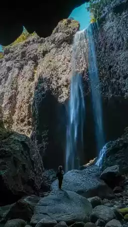 Look up to see a narrow strip of sky, look down to find a cool pool, and the wind carries mist that creeps into your neck.