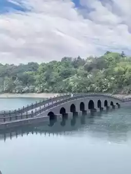 ✅ Jinlong Bridge: This long golden dragon bridge spans the lake, connecting two islands. Standing on the bridge, enjoy the lake and mountain scenery, feel the breeze, and the aerial shots are stunning.