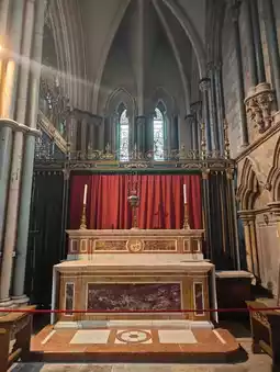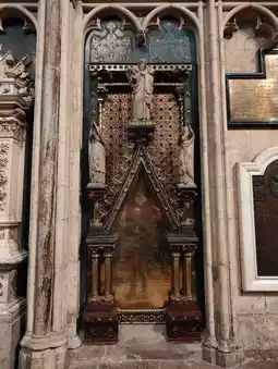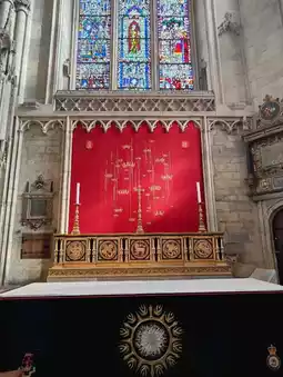 Inside York Minster, amidst the towering stone and stained glass, a corner glows with colour and reverence. A golden frame catches the eye—ornate, gleaming, inscribed with the name John Edward, Dean of the Cathedral. It stands not alone, but surrounded by symbols of devotion: a crimson cloth draped with care, a cross positioned in quiet dignity, and paintings that echo centuries of faith and artistry.