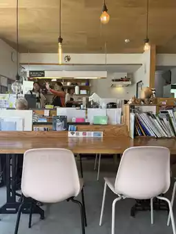 The on-site cafe space offers a place to relax with coffee and snacks and chat with islanders and travelers.