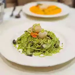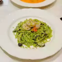 Pistachio Scallop Pasta This spaghetti is a surprise. The scallops are cooked just right, crispy on the outside and tender on the inside. The crumbled pistachio adds to the taste. The spaghetti itself absorbs the freshness of the seafood🌿