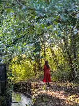 After passing through the roadside and the natural rural scenery with sunlight filtering through the trees,