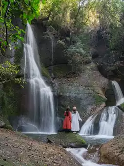 There are various ways to enjoy it, such as climbing a nearby rock to get a closer look at the waterfall, or taking a photo with the gaping tunnel in it.