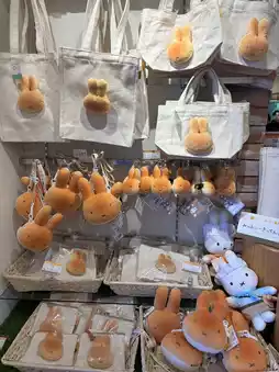 This shop offers a variety of Miffy-themed items, from Miffy-shaped bread to ice cream, keychains, bags, and other Miffy merchandise.