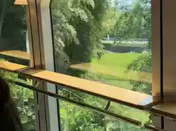 As soon as I stepped onto the Yufuin-no-Mori train, I was immediately enveloped by the warm, wood-toned interior. From the floor, walls, armrests, to luggage racks, the abundant use of wood creates a calm and elegant atmosphere, reminiscent of a forest cabin. My seat was next to a large picture window, and the dark green velvet was soft and comfortable, with a classic floral pattern adding a touch of sophistication.