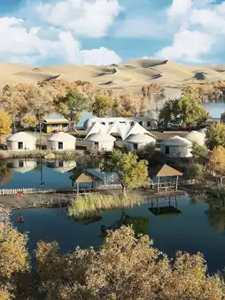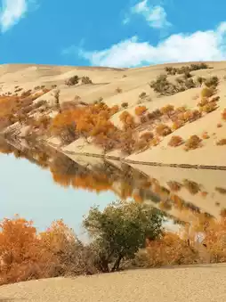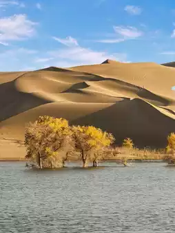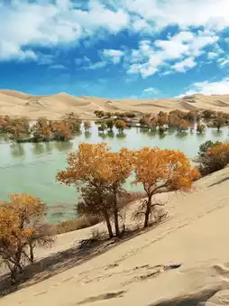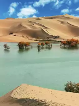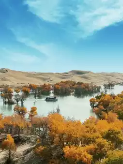 🚤 Upon arrival, you can choose to take a sand dune motorcycle or a boat (about 80 RMB per person) to the central area, or walk about two kilometers to slowly enjoy the changing scenery. Standing atop the sand dunes and looking far, you will see sand dunes surrounding shimmering waves, with yellow and green poplars either lining the lake shore or standing in the water, weaving an autumn dream.